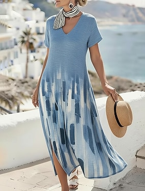Femmes Robe Midi Robe Décontractée Robe trapèze Robe Imprimée Mode Moderne Extérieur Vacances Fête Coupe régulière A Ombre Géométrique Manche Courte Col en V Bleu Été Printemps