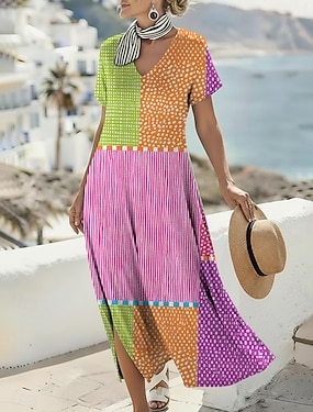 Femmes Robe Midi Robe bohème Robe Décontractée Robe trapèze Robe Imprimée ancien Extérieur Vacances Week-end Coupe régulière Bloc de Couleur Manche Courte Col en V Arc-en-ciel Été Printemps