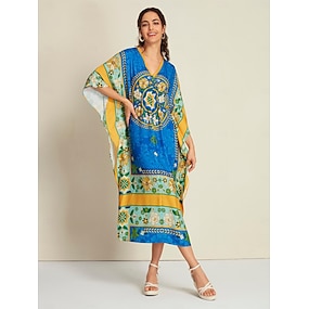 Femmes Robe en Satin Robe Caftan Robe Midi Bleu Raglansleev Imprimé bandana Taille Élastique Été Col en V Vacances Style Ethnique S M L