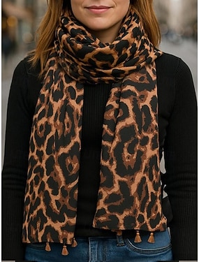 Écharpe à pompons imprimé léopard pour femme – châle doux et léger surdimensionné avec franges, style bohème chic pour l'automne/hiver, tenues décontractées, bureau, voyages et cadeaux