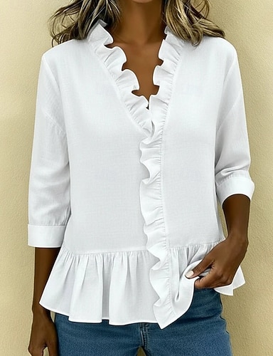Chemisier/chemise femme 100% coton, couleur unie, style vintage élégant et moderne, manches longues, col en V, coupe classique, idéal pour le quotidien, les vacances et les sorties. Disponible en blanc, rose, bleu ciel, vert, printemps et automne.