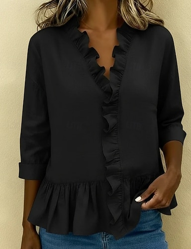 Chemise femme en coton lin unie élégante décontractée à manches longues col en V haut régulier quotidien vacances boutons noir blanc rouge été printemps