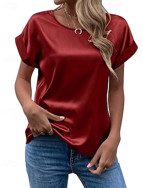 Femmes Elegant Haut en satin T-shirt Hauts Soyeux Uni Mode Moderne Manche Courte Col ras du cou Hauts Réguliers Quotidien Sortir Week-end Vin Vert Véronèse bleu marine Kaki Beige Été