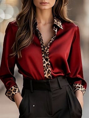 Femmes Chemise Elegant Haut en satin Chemisier Froncé Patchwork Boutons Léopard Uni Élégant ancien Dames manche longue Col de chemise Hauts Réguliers Quotidien Travail Fête Rouge Vert Gris Automne