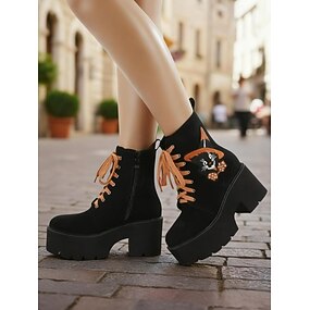 Bottines à lacets à plateforme pour femme avec broderie chat pour Halloween – Bottines à talon épais en daim noir pour festivals d'automne, streetwear et soirées costumées