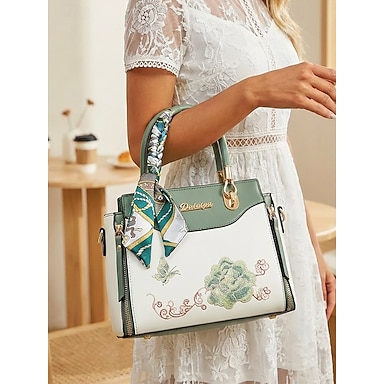 Sac à main en similicuir brodé pour femme avec accent foulard – élégant sac à bandoulière et poignée supérieure florale pour le bureau, les mariages et les sorties quotidiennes