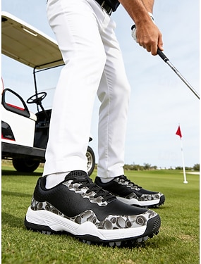 chaussures de golf noires et blanches pour hommes avec semelle à crampons, tige respirante et conception légère pour plus de confort et de soutien sur le parcours de golf