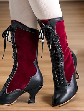 Bottes mi-mollet à lacets victoriennes rouges et noires des années 1920 pour femmes – chaussures de costume rétro de style édouardien steampunk pour cosplay, théâtre et soirées Gatsby