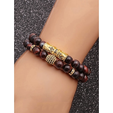 ensemble de bracelets de perles pour hommes – pierres d'œil de tigre rouges avec des accents plaqués or et des incrustations de cristaux noirs pour un look élégant
