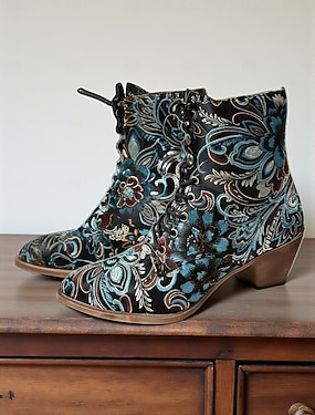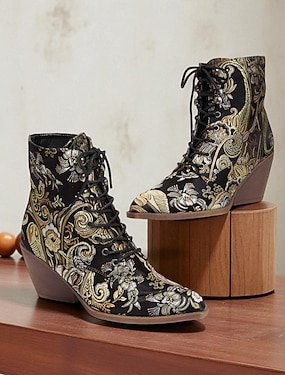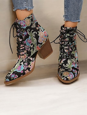 Bottines à lacets en jacquard violet pour femme, ornées de broderies florales et dotées d'un petit talon bloc – bottines de style baroque vintage, parfaites pour les festivals et les soirées Gatsby.