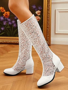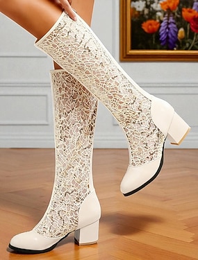 Bottes mi-mollet en dentelle blanche pour femmes avec talons creux sculptés en or - bottes élégantes en maille de style pour mariages, fêtes de jardin et cosplay victorien