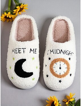 Pantoufles d'intérieur blanches en polaire douce pour femme, ornées de broderies lune et horloge – mules chaudes et confortables à enfiler, idéales pour se détendre dans la chambre ou comme cadeau original.