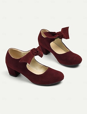 talons mary jane vintage pour femmes avec décoration en nœud papillon – chaussures à talon moyen épais en daim rouge pour événements formels