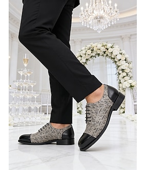 Chaussures de mariage haut de gamme pour hommes en cuir - modèle gris à motifs avec bout en cuir noir, chaussures habillées élégantes pour les mariages et les occasions spéciales