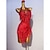 Robe de danse latine rouge à paillettes et franges pour femme, dos nu, décolleté plongeant en V, idéale pour les compétitions de bal de salon.