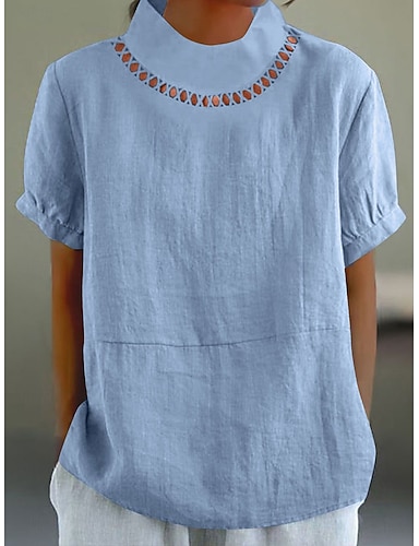 Femmes Chemisier Faux coton lin Couleur Unie Élégant Occasionnel Manche Courte Col roulé Hauts Réguliers Quotidien Fête Bleu Blanche Été