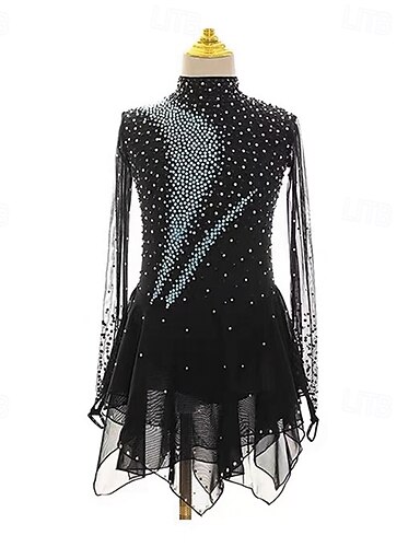 Robe de patinage artistique Femmes Patinage Robe Noir Patchwork Ourlet asymétrique Haute Élasticité Entraînement Compétition Tenue de Patinage Classique cristal pailleté Sans manches Patinage sur
