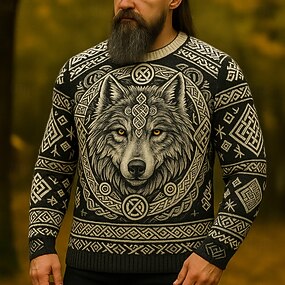 Homme Animal Loup Viking Pull Tricots Col Rond Rétro Vintage Occasionnel Vacances Quotidien Impression 3D Garder au chaud manche longue Printemps Automne Hiver Noir Gris foncé Gris