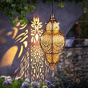 Lanterne solaire suspendue en métal de style marocain, étanche, idéale pour l'éclairage et la décoration de jardins, terrasses, allées, cours, porches et jardins.