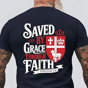 T-shirt religieux chrétien à manches courtes, coupe standard, idéal pour un homme, avec le message « Sauvés par la grâce au moyen de la foi » (Éphésiens 2:8). Motif : bouclier rouge, croix, couronne,