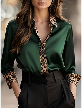 Femmes Chemise en satin Chemise habillée Chemisier Patchwork Boutons Imprimé Léopard Élégant Occasionnel manche longue Col Rabattu Hauts Réguliers Quotidien Extérieur Vêtements de rue Rouge Vert Gris