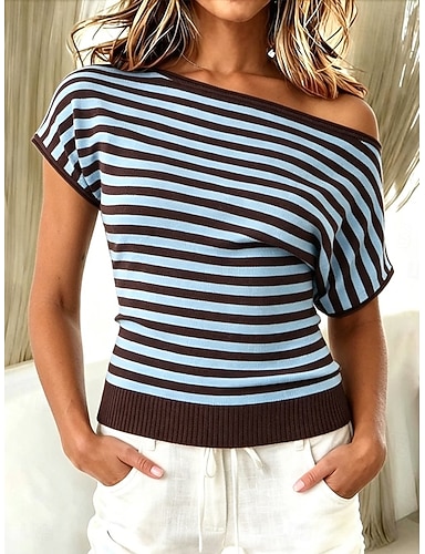 Femmes T-shirt Imprimé Rayé Mode Élégant Occasionnel Manche Courte Asymétrique Hauts Réguliers Occasionnel Quotidien Sortir Bleu Jaune Été Printemps
