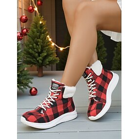 Bottines montantes à lacets pour femme, à carreaux rouges et ornées de fausse fourrure – des baskets d'hiver confortables idéales pour le shopping des fêtes, les soirées de Noël et les promenades par temps froid.