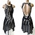 Robe de danse latine noire à strass pour femme - robe de bal asymétrique à manches longues en tulle et volants.