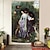 Tapisserie murale victorienne vintage représentant une femme élégante en robe blanche à fleurs roses, avec un chien blanc. Portrait classique, décoration murale pour salon, chambre ou galerie d'art,