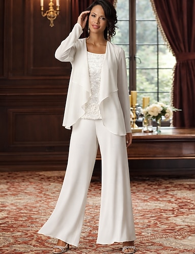 Trois Pièces Tailleur Pantalon Longueur au sol Robe de Mère de Mariée Manche 3/4 Col carré Élégant Simple Luxueux Formel robe demoiselle d honneur Chiffon avec Broderie Appliques