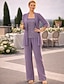 Combinaison Tailleur-Pantalon Trois Pièces Longueur au sol Robe de Mère de Mariée Sans manches Col Rond Élégant robe demoiselle d honneur Chiffon Dentelle Echarpe incluse avec Paillettes