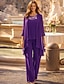 Combinaison Tailleur-Pantalon Trois Pièces Longueur au sol Robe de Mère de Mariée Manche 3/4 Col carré Élégant Formel robe demoiselle d honneur Chiffon Pailleté avec Paillettes Appliques