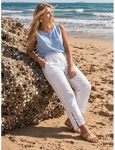 Femmes Pantalon en coton et lin Chinos Droit Vacances Streetwear Basique Longueur complète Taille moyenne Uni Avec Poches Taille Élastique Confortable Confort Non Elastique Quotidien Extérieur