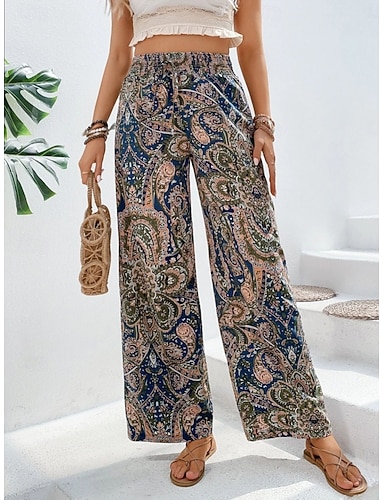 Femmes Jambe large Chinos Vacances ancien Streetwear Longueur complète Taille haute Paisley Avec Poches Ceinture Élastique Imprimé Confortable Confort Doux Élastique Extérieur Vacances Rue Bleu