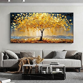 Peinture à l'huile faite à la main sur toile, décoration murale moderne abstraite, paysage d'arbre doré pour la décoration intérieure, cadre tendu, peinture suspendue/peinture roulée sans cadre,
