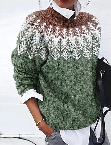 Femmes Pull Occasionnel Doux Géométrique Côtelé Col ras du cou Tricoté Imprimé manche longue Hauts Réguliers Tricoter Extérieur Quotidien Week-end Vert Gris foncé Automne Hiver