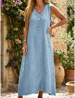 Femmes Robe Maxi Faux coton lin Robe fourreau Robe Décontractée Mode Basique Moderne Quotidien Vacances Sortir Coupe Ample Uni Sans manches Col en U Bleu Jaune Rose Claire Rouge Été Printemps Automne