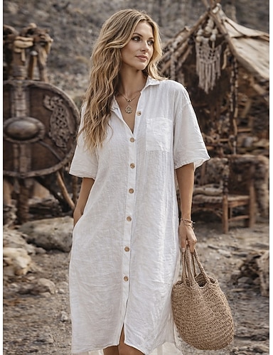 Femmes Robe Longueur Genou Faux coton lin Robe fourreau Robe Décontractée Robe en Coton Mode Moderne Quotidien Week-end Coupe Ample Uni Manche Courte Col de chemise Bleu Blanche Jaune Été Printemps