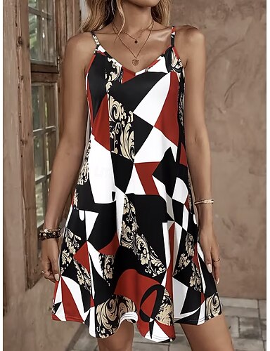 Femmes Mini Robe Robe trapèze Robe Nuisette Robe à épaules dénudées Vacances Occasionnel Plage Sortir Coupe Ample Graphique Géométrique Sans manches Col en V Rouge Été Printemps