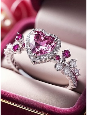 Bague pour femme en forme de cœur avec pierre précieuse rose – alliage, pierres roses et transparentes, design élégant – parfaite pour les mariages et la Saint-Valentin