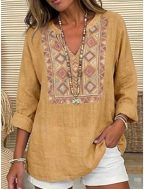 Femmes Chemise Tunique Imprimé Graphique Géométrique ancien Quotidien Élégant manche longue Col en V Hauts Réguliers Quotidien Fête Jaune Été Printemps