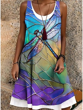 Femmes Mini Robe Robe d'Été Robe trapèze Robe à épaules dénudées Vacances Occasionnel Boho Quotidien Coupe régulière Graphique Animal Libellule Sans manches Col ras du cou Bleu Violet Vert Ét