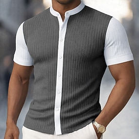 Homme Chemise Tricot côtelé Chemise Décontractée Chemise Boutonnée Bleu Noir Violet Kaki Gris Manche Courte Uni Col grand-père Occasionnel Quotidien Patchwork Vêtement Tenue Élégant Mode Contemporain