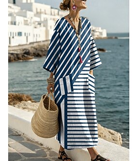 Robe Maxi Femme Lin Comme Robe Shift Décontractée Quotidien Coupe Lâche Graphique Géométrique Rayé Manches Longues Col en V Bleu Jaune Violet Vert Été Printemps