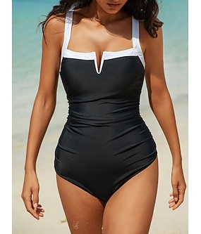 Maillot de bain une pièce femme amincissant froncé à armature colorblock monokini contrôle du ventre taille haute slim dos nu vêtements de plage de vacances couleur unie col en V sans manches