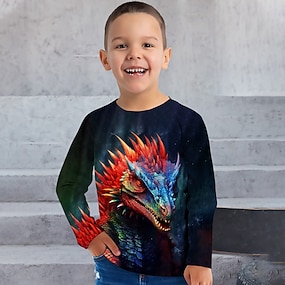 T-shirt Tee Enfants Garçon Animal Dinosaure manche longue Col ras du cou Haut pour enfants Casual 3D effet Frais du quotidien Automne Hiver Vert foncé 7-13 ans