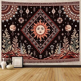 Tapisserie murale soleil, motif losanges célestes, art ethnique bohème et tribal pour salle de yoga, espace de méditation, chambre, décoration intérieure