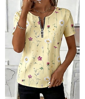 Femmes T-shirt Fermeture éclair Fleuri Graphique Plantes Élégant Occasionnel Manche Courte Col ras du cou Hauts Réguliers Quotidien Sports Week-end Bleu Jaune Rose Claire Violet Vert Été Printemps