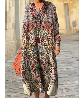 Femmes Robe maxi Robe fourreau Occasionnel Quotidien Sortir Coupe Ample Fleuri Graphique manche longue Col en V Bleu Rouge Beige Été Printemps