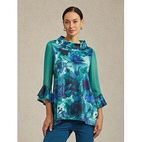 Chemisier femme gris bleu fleuri col montant manches à empiècements transparents ourlet asymétrique coupe confortable décontracté vacances printemps été automne